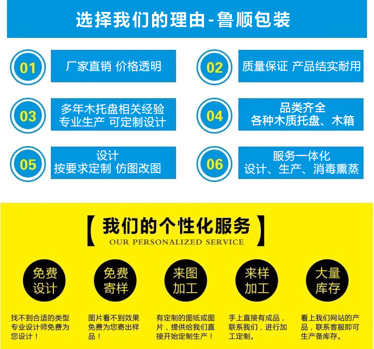 苏州鲁顺包装有限公司是一家专注于苏州木托盘,木箱、仓储物流设备的生产、加工、销售为一体的实体型企业。专业生产各种木托盘,免熏蒸托盘,包装箱,免熏蒸木箱等包装制品,厂家直销,服务至上。已有多年的生产经验,先进的设备,完善的销售服务网络。近年来鲁顺包装一直相伴随着江、沪、浙等多家知名企业创造产业佳绩。为他们提供了优质、及时、有效的包装类产品及服务。面对各企业,我们将会提供包装行业直接、有效、经济、安全、优质的产品。